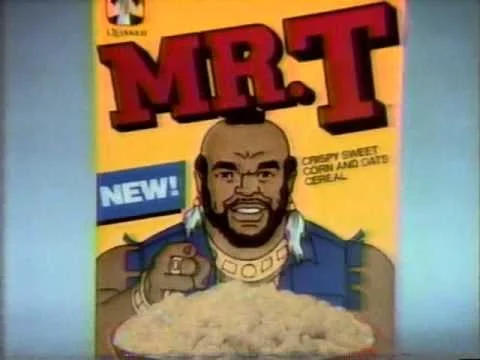 | Mr. T Cereal | Mister T cartoon | 1984–1993 | Sweet corn and oats in T shapes with a quotable tagline | Featured in Pee-wee’s Big Adventure during the over-the-top breakfast scene. |