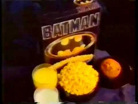 | Batman Cereal | Batman 1989 film and animated branding | 1989–1991 | Corn puffs in bat shapes in a sleek black box | The box with a plastic coin bank became a popular unopened collectible. |